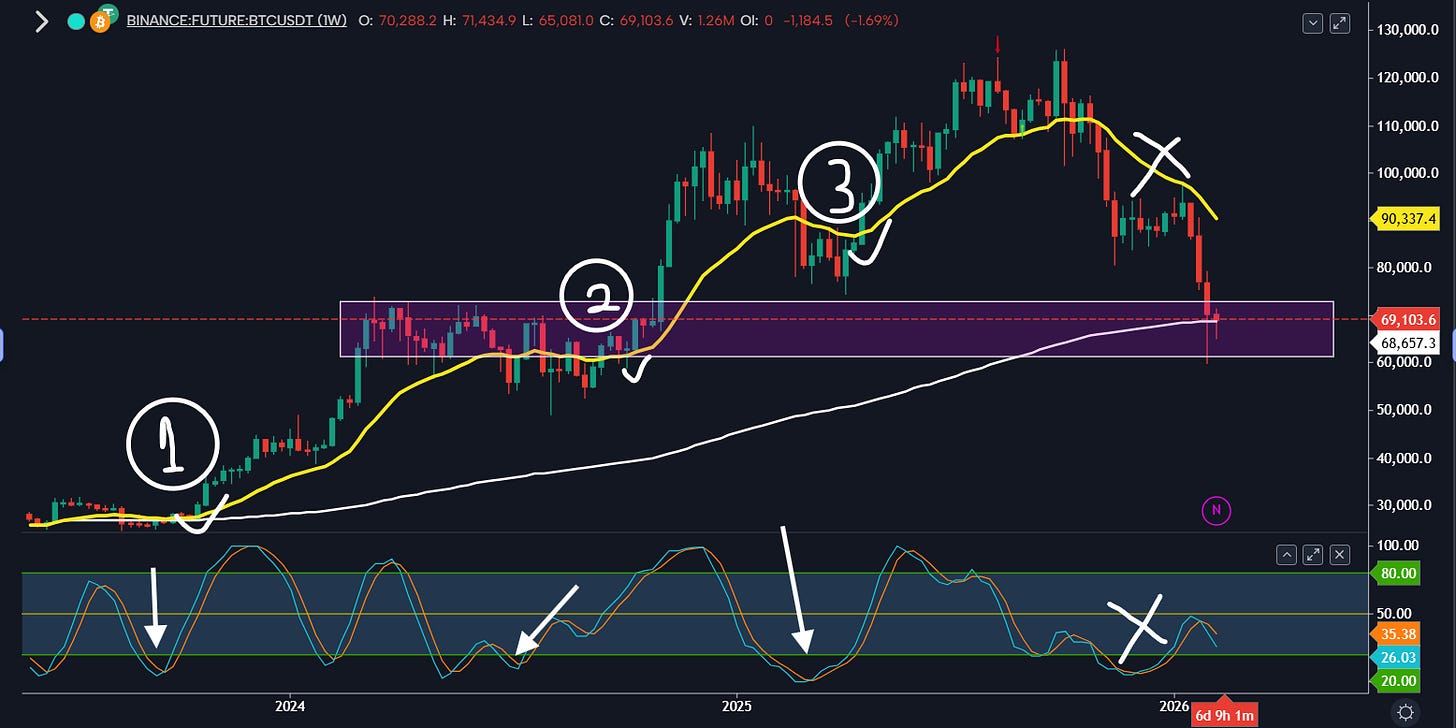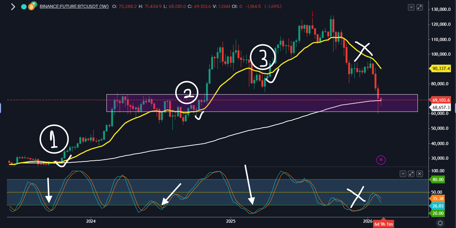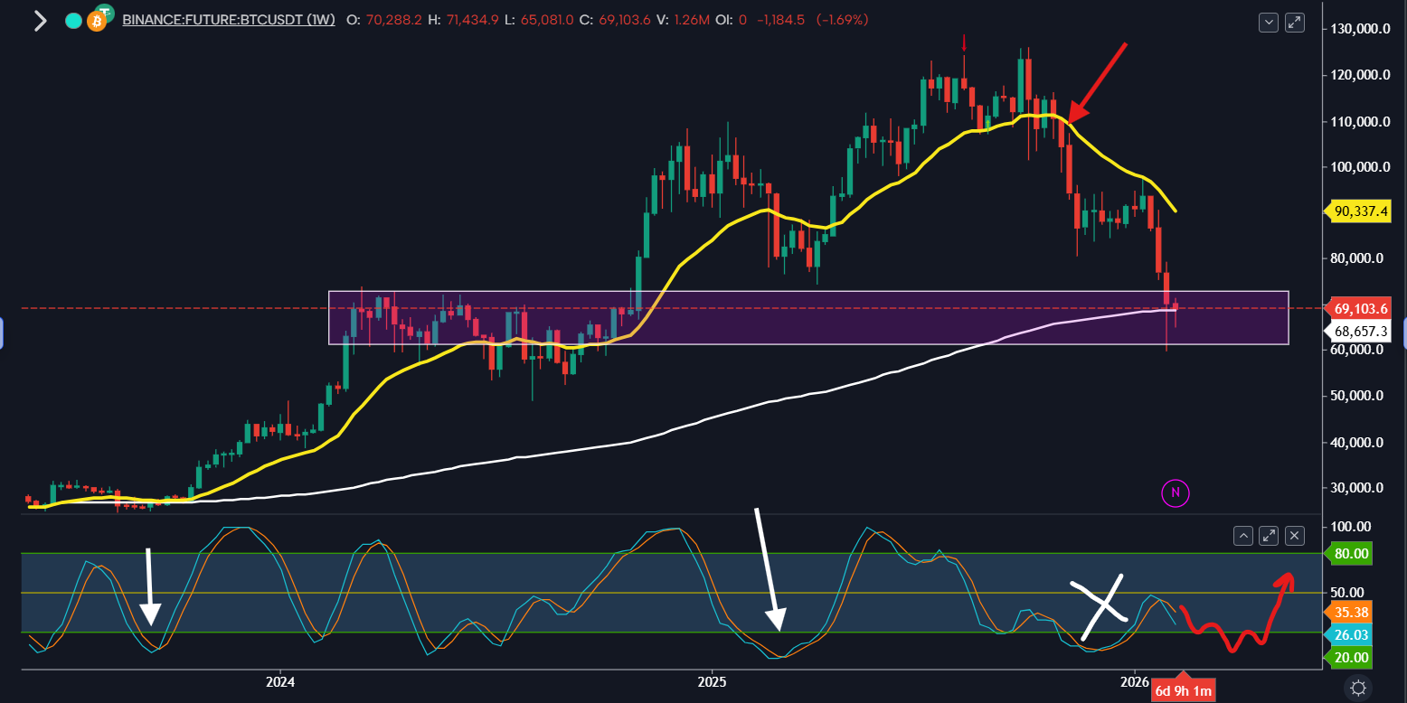 Note: Currently, due to the sharp decline from $110k in November 2025, we have lost both the 20-week and 200-week EMAs. This confirms we are in a bearish phase, not just a dip. Therefore, we now need to wait for the RSI to drop below that sub-8% level to signal a reversal before expecting a potential bottom. See the chart below.