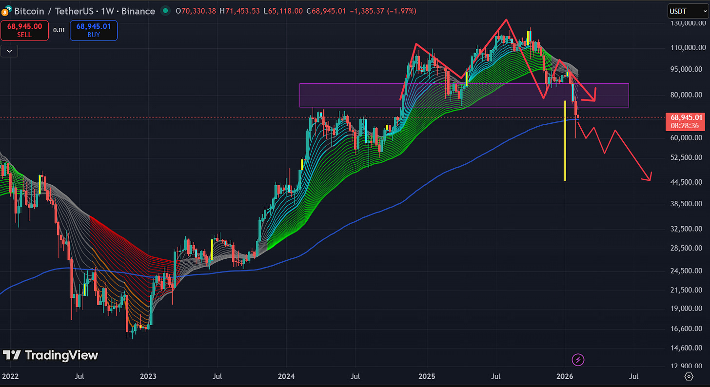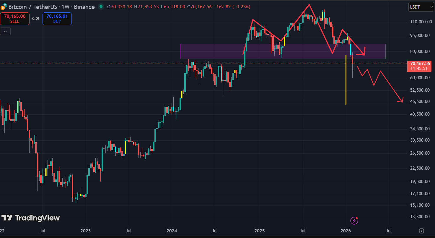 Recently, panic selling of Bitcoin intensified after the price fell below the massive weekly head-and-shoulders pattern we identified a few weeks ago. Since then, the market has broken below our critical neckline at around the $79000-$77,000 range, which once served as our main support.