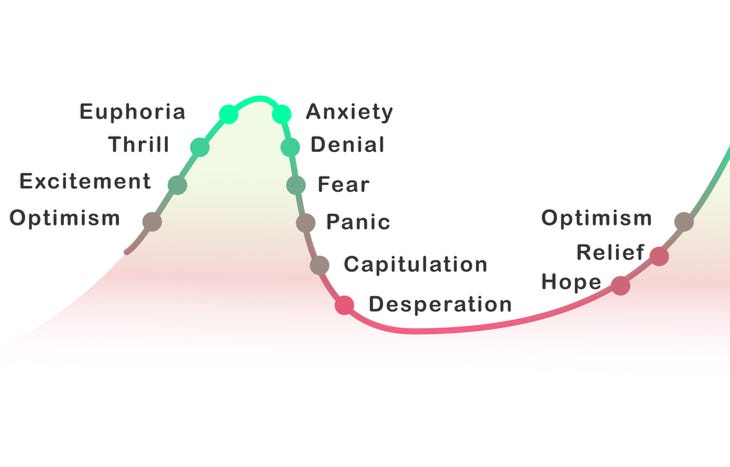 Typically, capitulation occurs after panic selling in a market cycle. It’s the stage when investors who were holding onto hope finally give up and sell their positions at a loss before the final downturn and potential bottom. See the illustrations in the chart below.